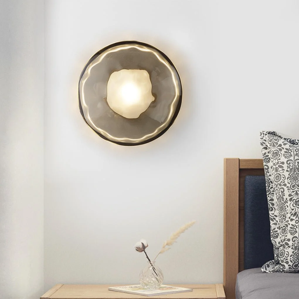 - Add a touch of modern elegance to your space with this round glass shell design wall sconce. Perfect for bedrooms, reading nooks, and study areas, this stylish wall light features a unique shell-textured glass lampshade that enhances your home or office decor.