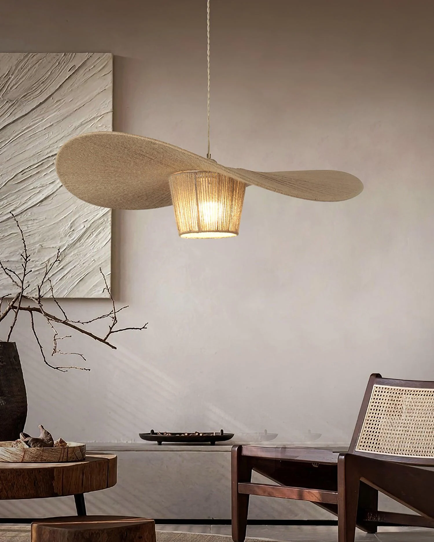 Elevate your interior with the charm of the Rustic Hat Pendant Lamp, a masterpiece of handwoven artistry. This pendant lamp exudes a vintage aura, with a shade crafted from hemp rope, woven by skilled artisans to create a texture that’s both rustic and refined. The wide-brimmed design not only casts a warm, inviting light but also adds an element of nostalgic elegance to your space. Suspended from a simple cord, this lamp is a nod to simpler times and artisanal craftsmanship, making it the perfect centerpiece for a room adorned with antique treasures or styled with a bohemian flair.