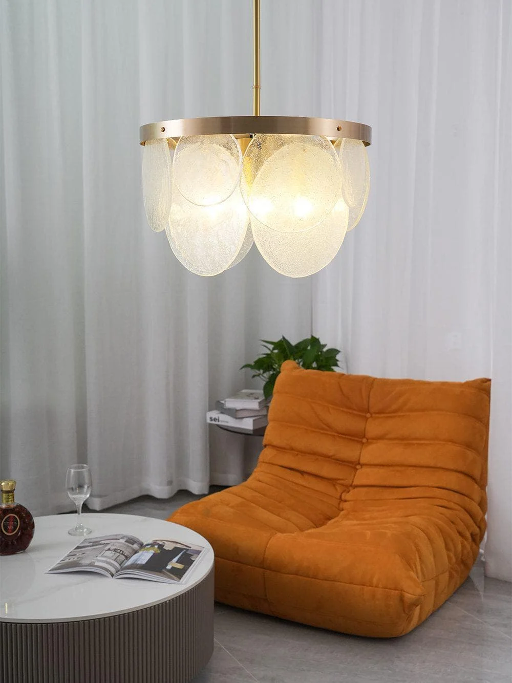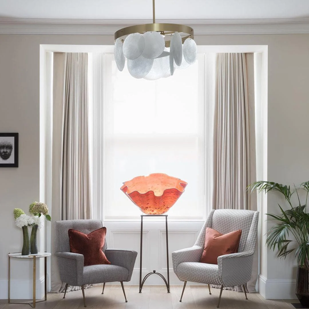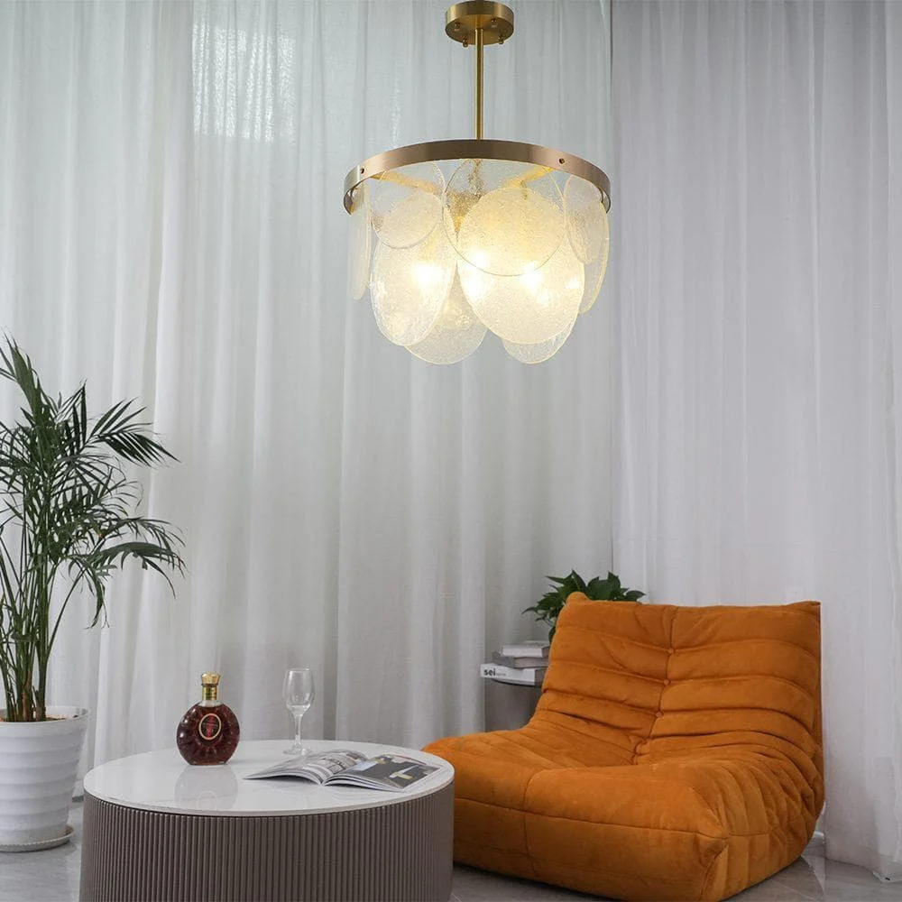 The Sasha chandelier is made of handmade glass and satin brass. Every piece of glass is unique. These drops are handcrafted by our artisans using a process that creates an undulating and crystalline texture that contrasts beautifully with the luxurious satin brass collar. This lamp emits a beautiful, warm, soft glow that has a strong presence that can brighten any room.