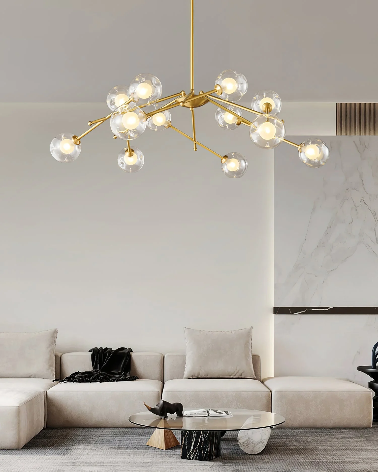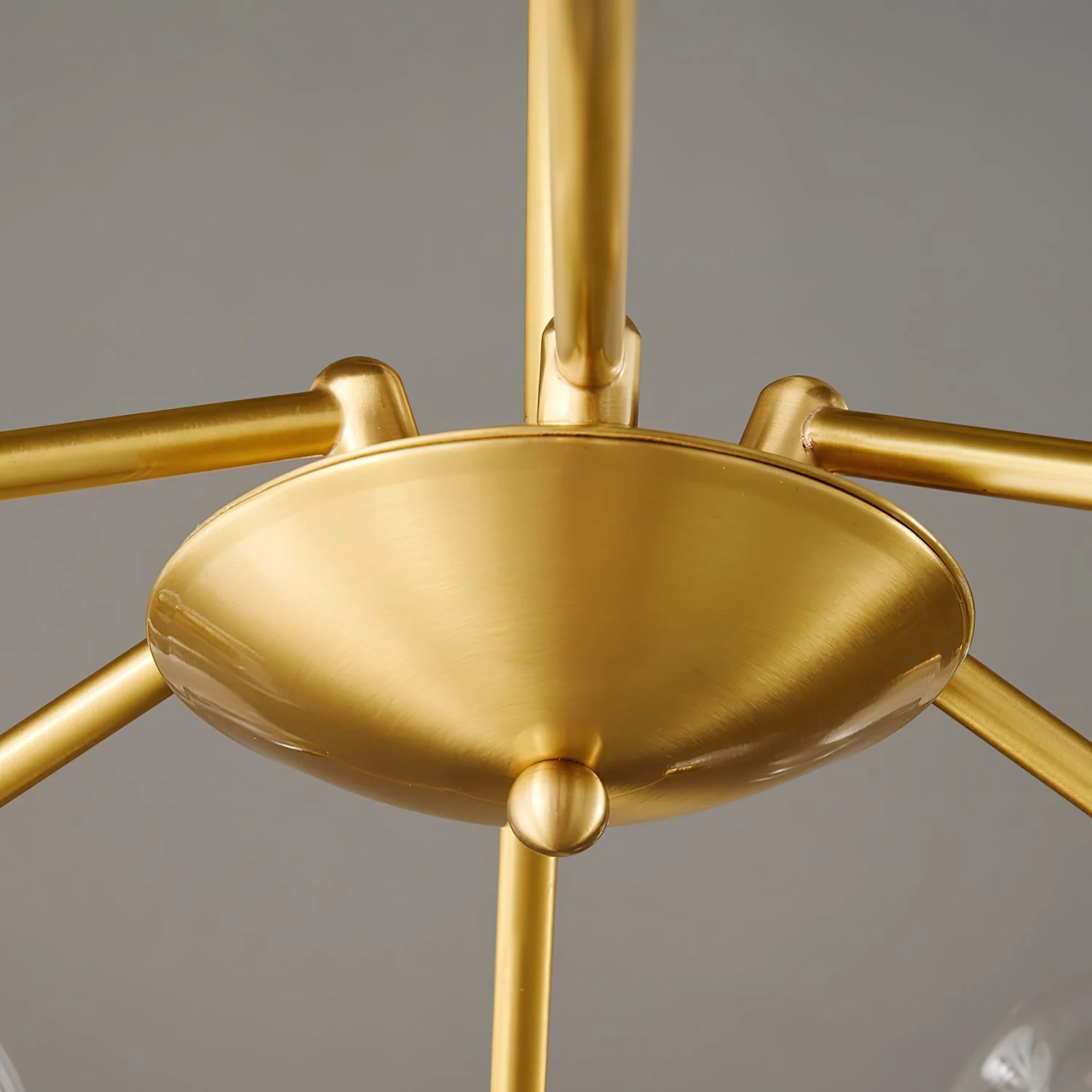 The Saylor Brass Chandelier from Docos is a striking example of how contemporary design can be both functional and visually captivating. This elegant chandelier features a golden brass frame with multiple arms, each ending in a transparent globe that houses a warm light. Its sophisticated structure resembles a modern sculpture, making it not just a source of light but also a central art piece for any room.