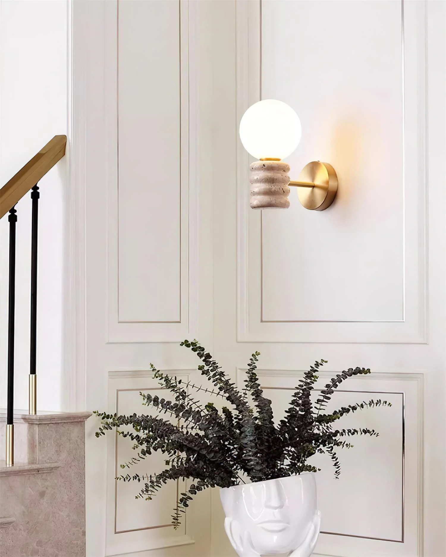 The Sena wall lamp, with its modern minimalist design philosophy and exquisite material combination, becomes a striking visual on the home wall. The body of the lamp is made from Yellow Travertinewith natural texturing, presenting clean and strong lines that offer a unique rustic charm. The smooth white glass shade paired with the matte gold metal components not only exhibits the simplicity and beauty of modern style but also serves as an elegant detail. When light filters through the soft glass orb, it provides not only uniform illumination to the indoor space but also adds a touch of warmth and tranquility to the living environment.