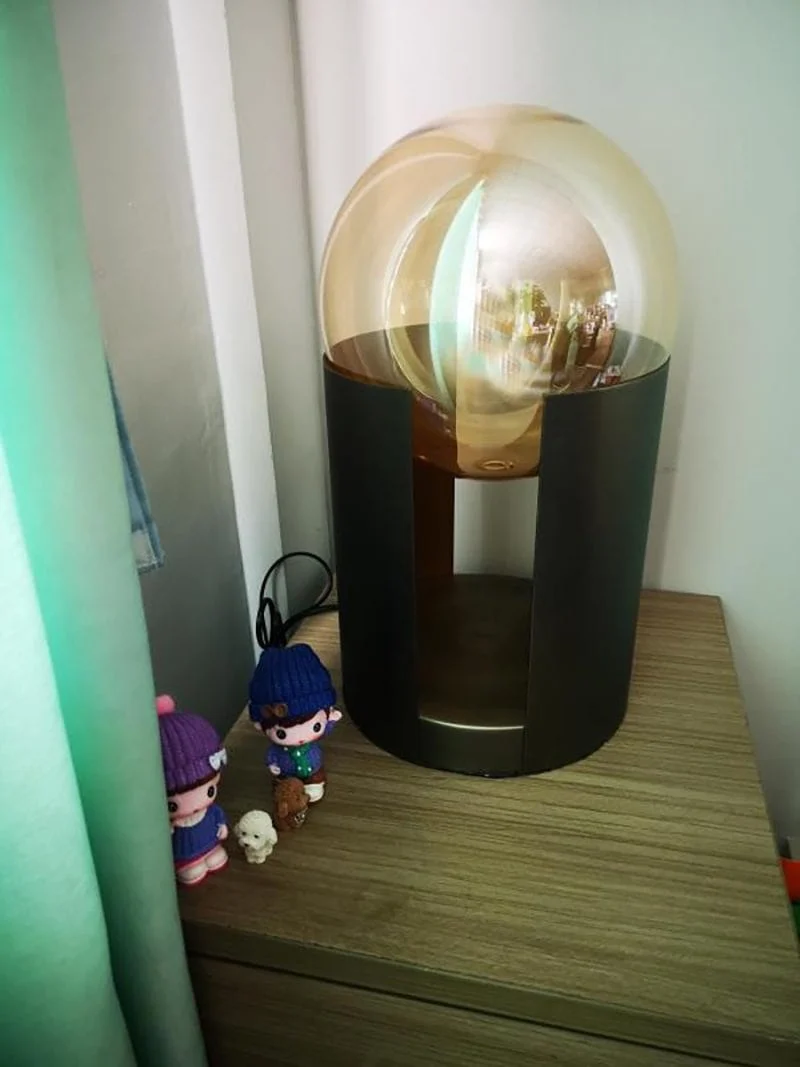 It is elegant and sophisticated, and is produced using only top materials: the two supporting elements are made of metal, and the luminous ball is made of blown glass, transparent or amber glass, hidden to cover the base.