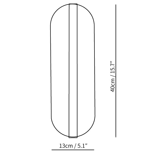 It has a low profile on the wall and can be placed vertically or horizontally. The oval shade evokes the look of alabaster. A brass metal band runs through the center of the shade. Integrated LED lights diffuse through it to cast ambient lighting and create warm reflections on the walls.
