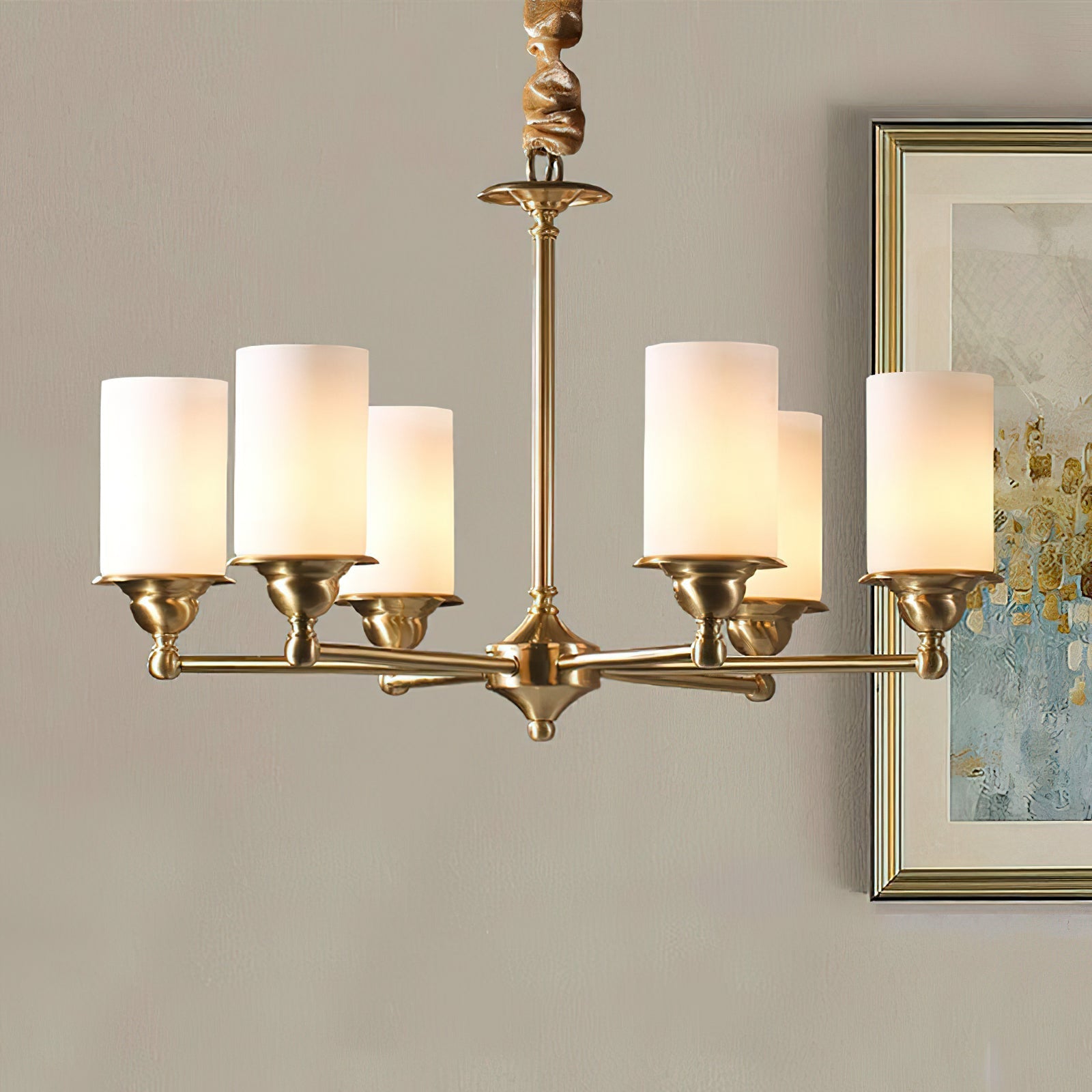 Enhance your space with the sleek and modern Stratton Chandelier. Crafted with a satin-finished brass frame and white glass cylinders, this chandelier adds a touch of sophistication to any room. Inspired by modernist architecture, it combines form and function for a clean and elegant look.