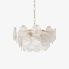 The Sue-Anne Ceiling Lamp showcases exemplary craftsmanship, covered with hand-pressed ribbed glass panels that resemble sand dollars. A stunning display of clear glass accented with Gold finish hardware is the focal point of this modern chandelier. Intricate detailing and a mix of clear and naturally tinted glass give the fixture its unique character.