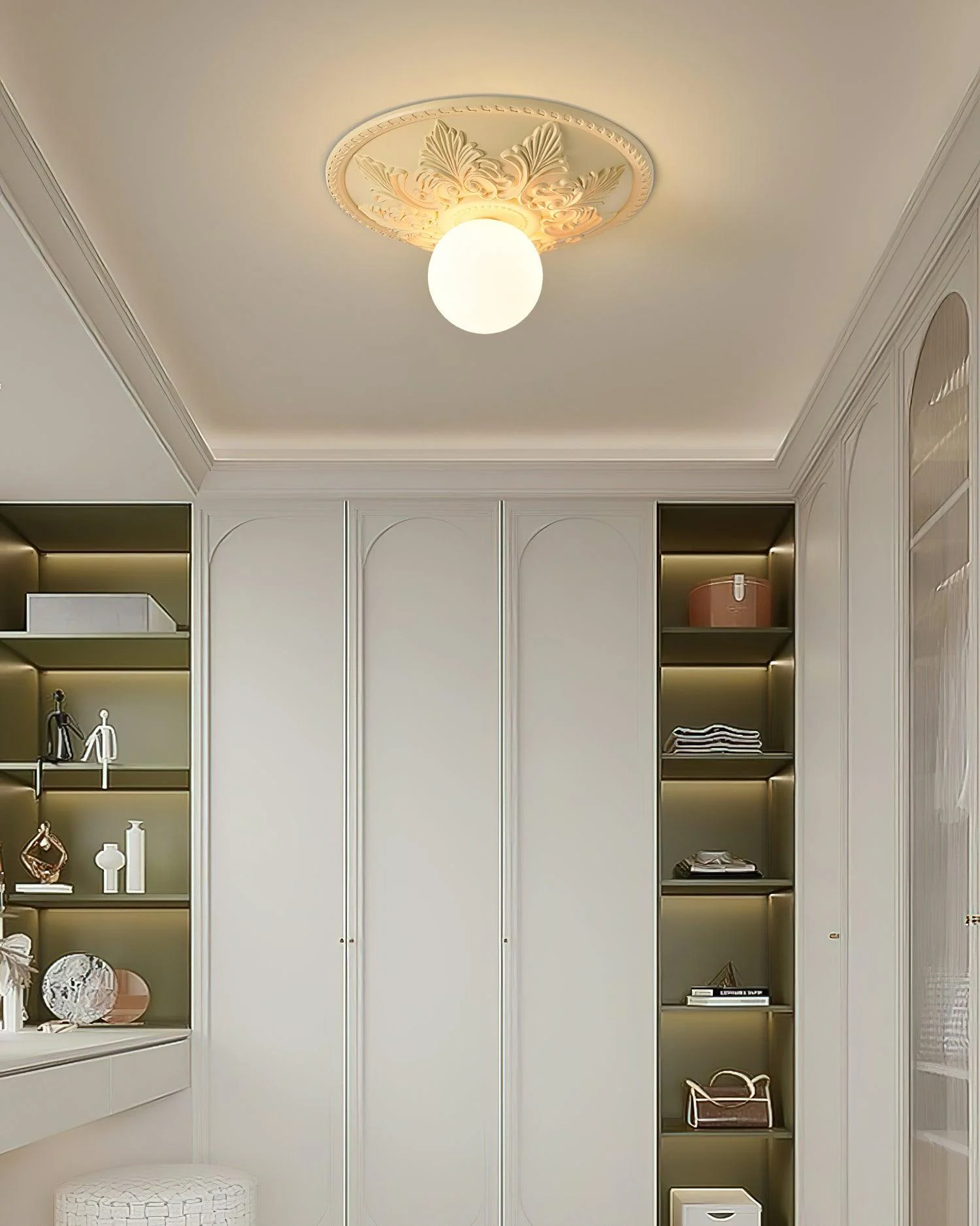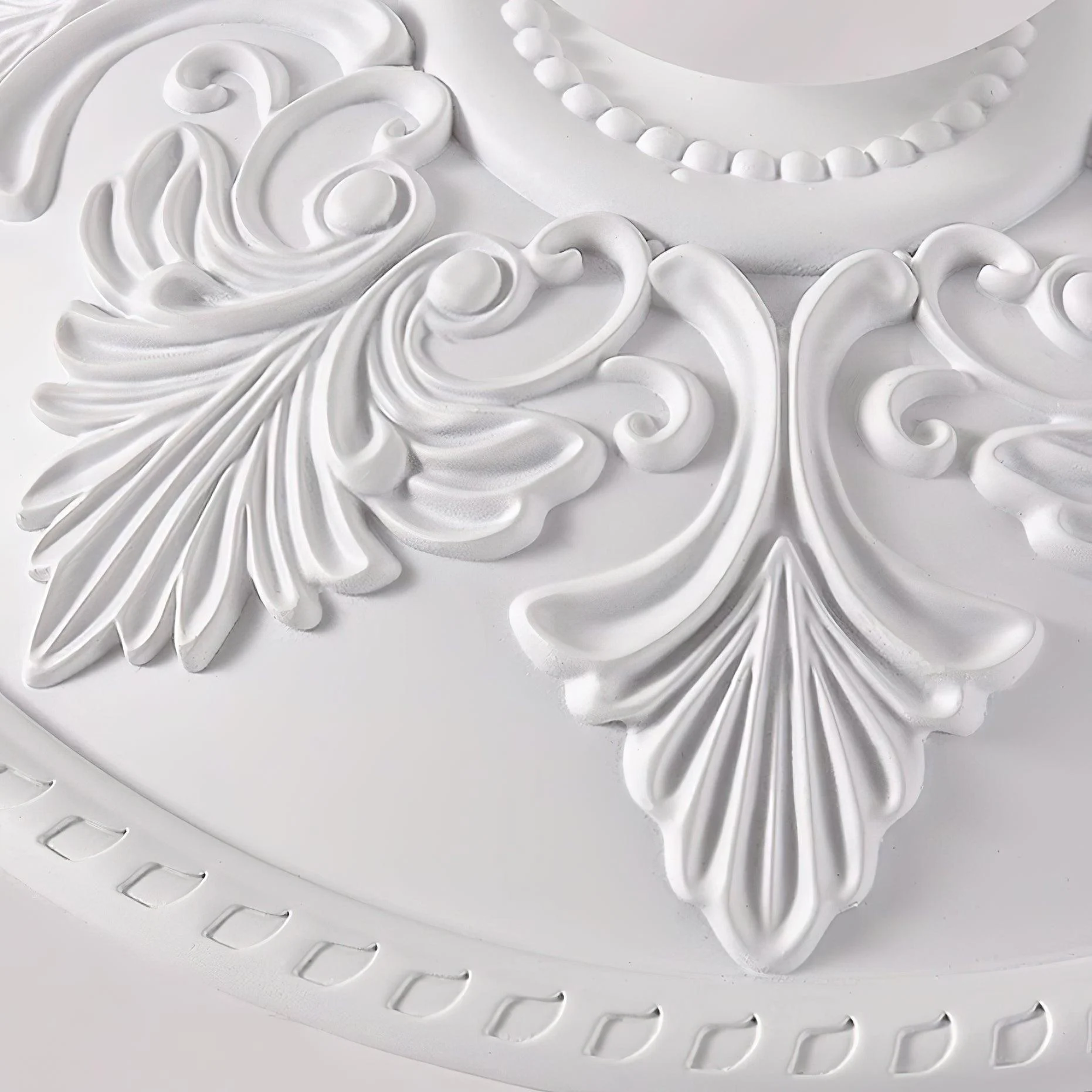 This Suilven Ceiling Light is a masterpiece of classic elegance and intricate craftsmanship. The design showcases a sophisticated ivory finish, featuring a beautifully sculpted ornate pattern with acanthus leaves and decorative flourishes that hark back to the grandeur of Baroque styling. The perimeter of the fixture is finished with a delicate beaded detail, adding a layer of texture and opulence. The central, frosted glass diffuser emits a soft, welcoming light that enhances the surrounding decorative elements, ensuring a warm ambience in any setting.