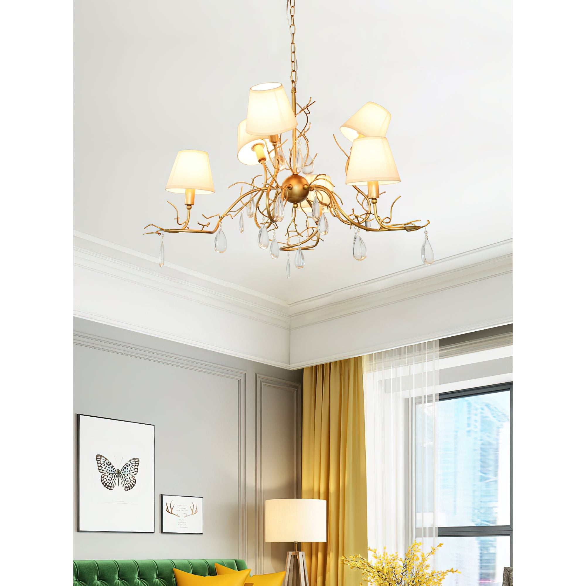 Handcrafted by expert artisans, the Tendril Chandelier is a masterpiece of design. This antique chandelier showcases a stunning organic tendril motif, with six lights that cast a warm, inviting glow over your decor. It comes with six white fabric lampshades and elegant crystal accents for added sophistication.