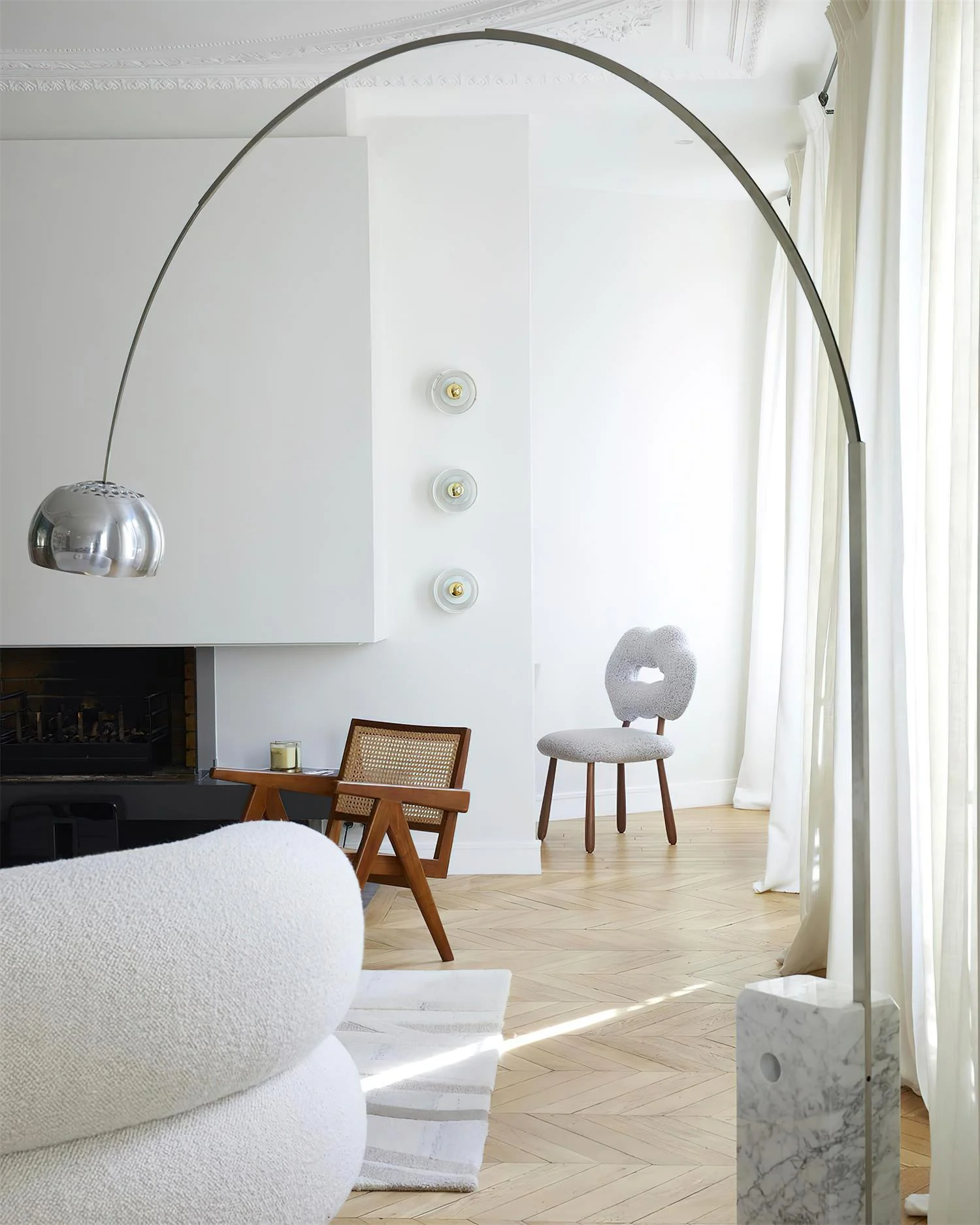 This Terra Art Floor Lamp design is imbued with a sense of modernity and minimalist beauty. Its sleek, curved structure not only exemplifies elegant curvature but also serves a practical lighting purpose. The base is made from high-quality marble, which offers both stability and a luxurious texture. The Silver-plated lampshade reflects a soft, non-glaring light that adds a warm atmosphere to your space.