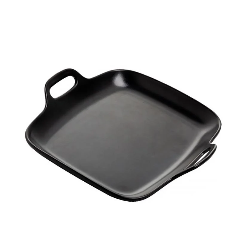 - Here’s a 4-piece set of farmhouse melamine trays that are both durable and stylish. Available in gray and black, each set consists of a round plate with handles, a square and a rectangular tray with handles, a tray with rounded corners, and a heart-shaped tray.