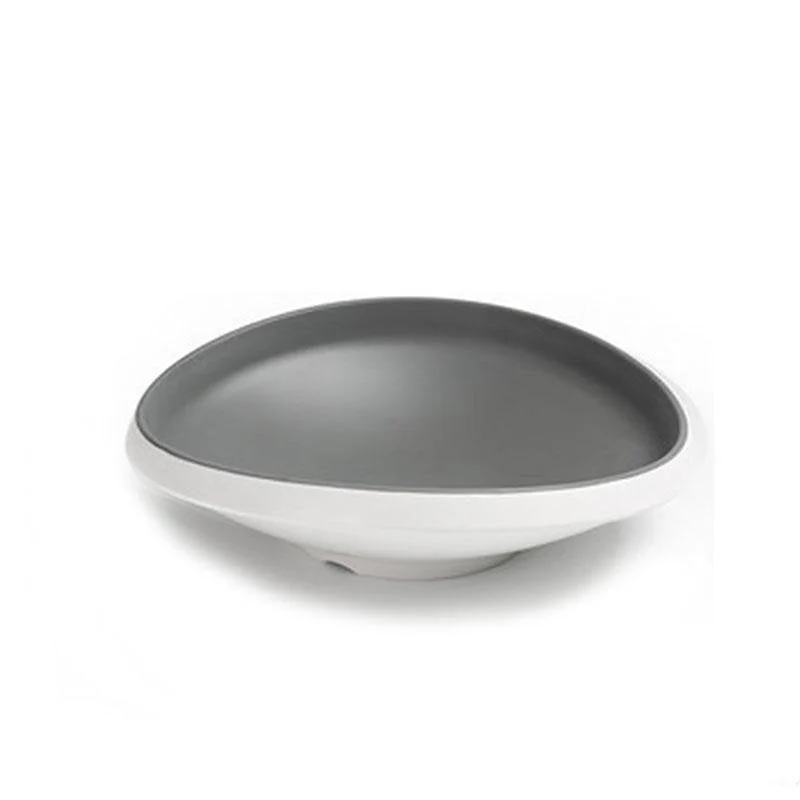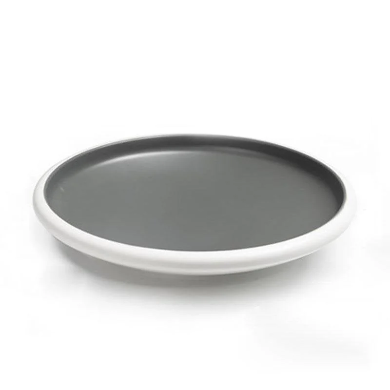 - This rustic melamine dinnerware takes a simple idea and enables a stylishly different collection. The outside of the dishes is white. Inside, the melamine is finished in gray. The serving dishes are various, shallow round, deep round, concave round, square recessed, hexagonal, and deep recessed hexagonal.