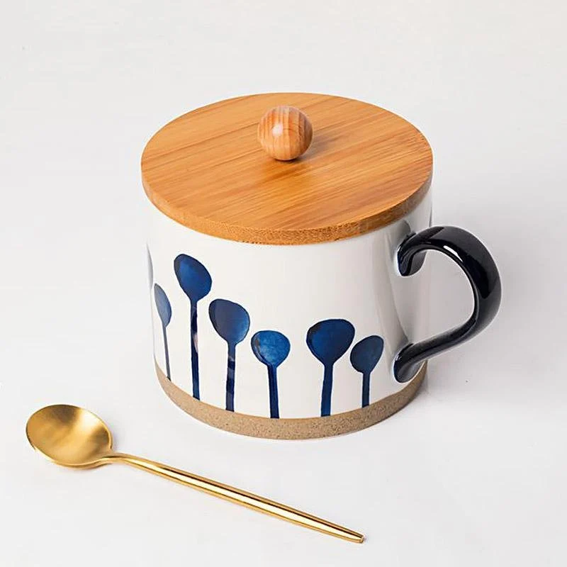 - Here’s a unique cup, lid, and spoon set in blue on white that will add character to your living space. There are four to choose from. Cup A features blue teardrops on the upper half. B showcases uneven blue lines on the outside. C has a combination of elliptical shapes and lines. D boasts a mix of irregular tree-style shapes.