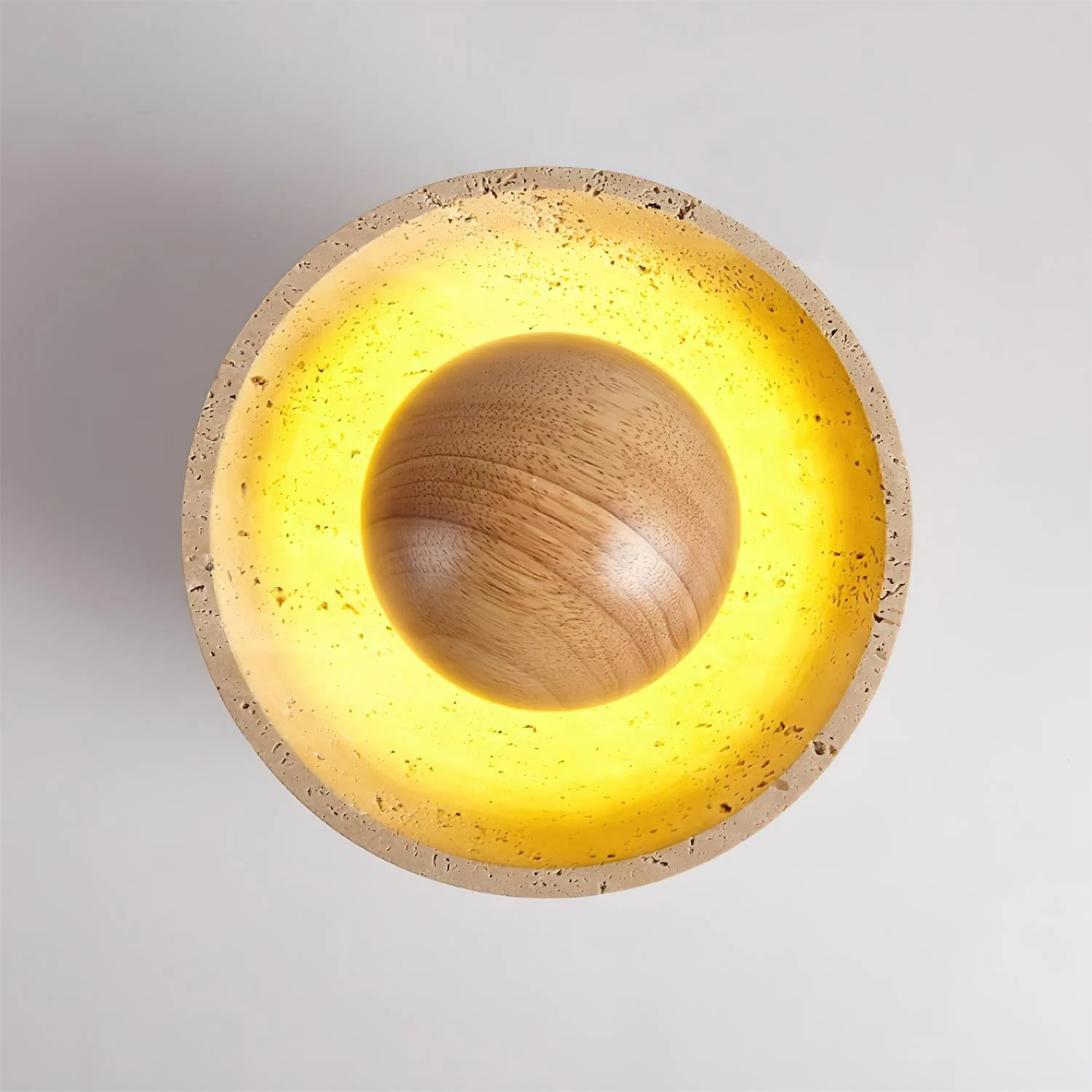 Introducing the Toccata Ceiling Light, where artistry meets illumination. This ceiling fixture boasts a meticulously crafted stone shade, intricately paired with a polished wooden globe, creating a captivating interplay of textures. The organic stone contrasts beautifully with the smooth, warm wood, making this light a standout piece.