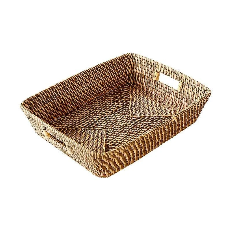 - An adaptable rattan basket that can also be used as a serving tray, it is also available in two different brown colors. The prominent borders mean that you can store any sizable plates, cups, and bowls as well as small cutlery without any risk of them falling out in the majority of situations.