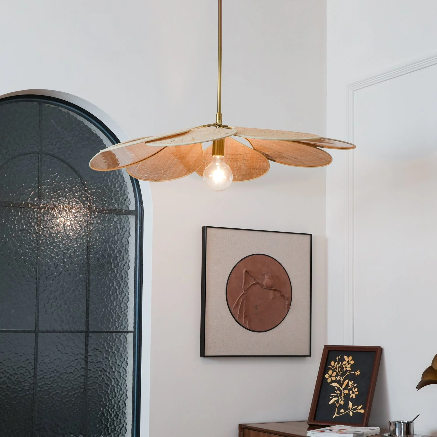 The Tory Bloom Rattan Pendant Lamp a beautifully crafted lighting piece that exudes a serene, organic aura. This pendant lamp features multiple layers of delicately shaped rattan petals, arranged in a bloom-like fashion that softly diffuses light while creating an enchanting play of shadows and light. Suspended from a sleek golden rod, its earthy tones and gentle curves introduce a calming element to any space, making it ideal for areas where relaxation is key, such as over a dining area or in a cozy reading nook.