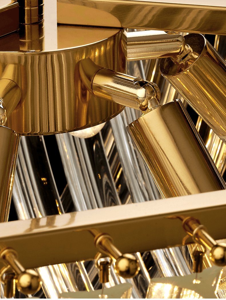 Elegant mid-century style chandelier crafted in Murano glass. Its original design plays on the repetition of sparkling glass elements capable of creating elegantly sophisticated lighting.