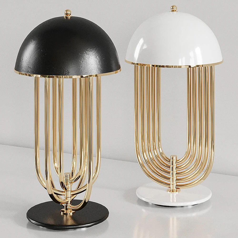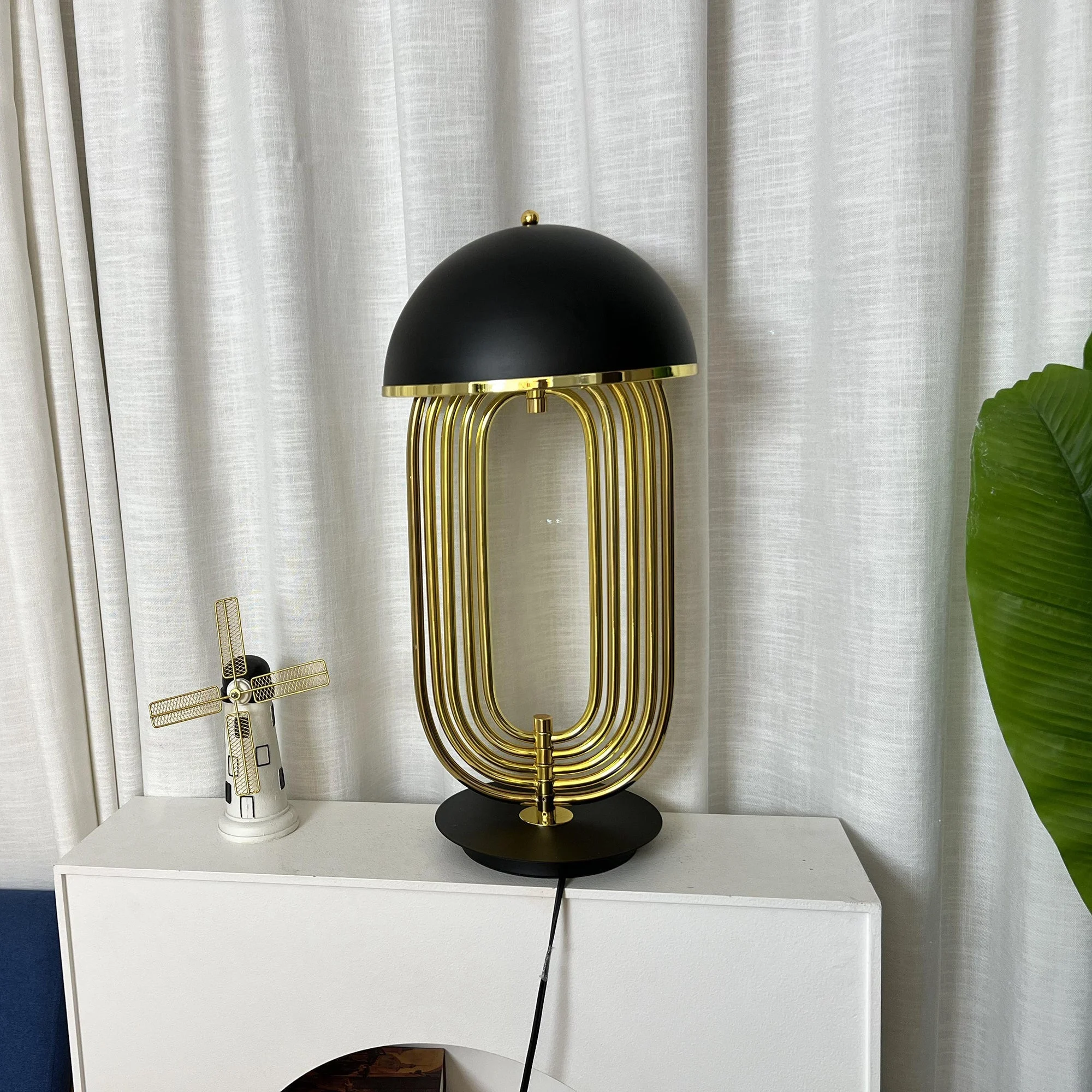 Turner table lamp is inspired by the exciting and unforgettable dance moves of pop singers. The tuner is a large table lamp handmade from brass and aluminum. The body adopts a gold-plated finish, while the outside of the lampshade is coated with matte black and the inside is coated with gold powder to avoid unpleasant glaze for users. Five movable arcs can be rotated to the desired position, making this black table lamp full of fun, allowing you to create the most suitable composition for your modern home decoration