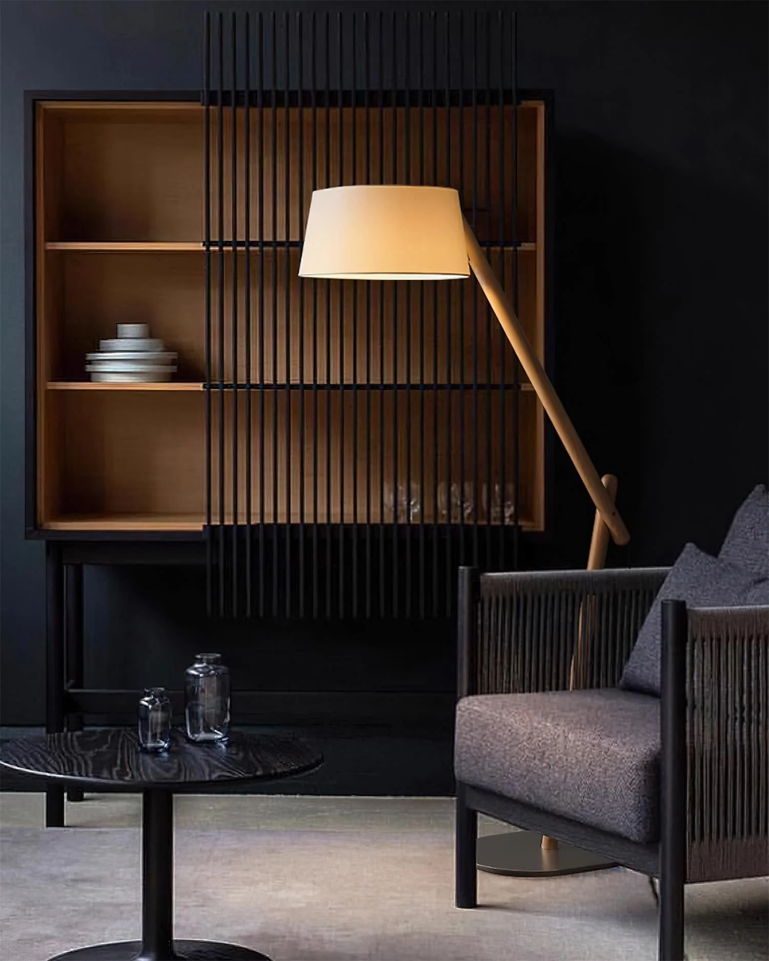 The Valeo Floor Lamp a testament to minimalist design that speaks volumes in style and functionality. This lamp features a slender, angular body crafted from high-quality materials, finished in a sophisticated dark hue that complements any decor. The lamp’s arm elegantly reaches out to suspend a gently curved, light-diffusing shade, providing ample illumination that is both soft and substantial.