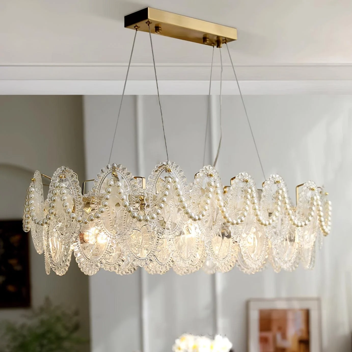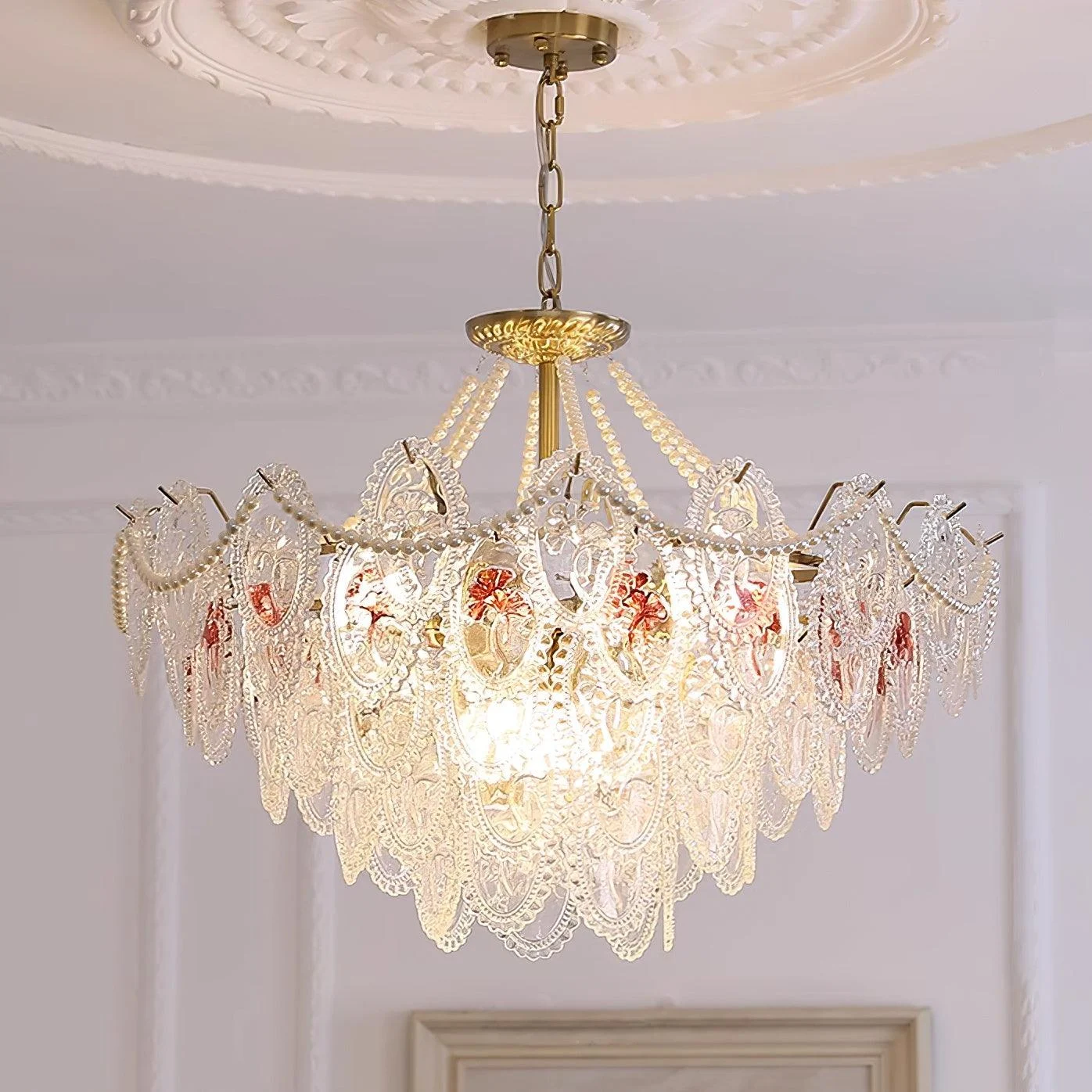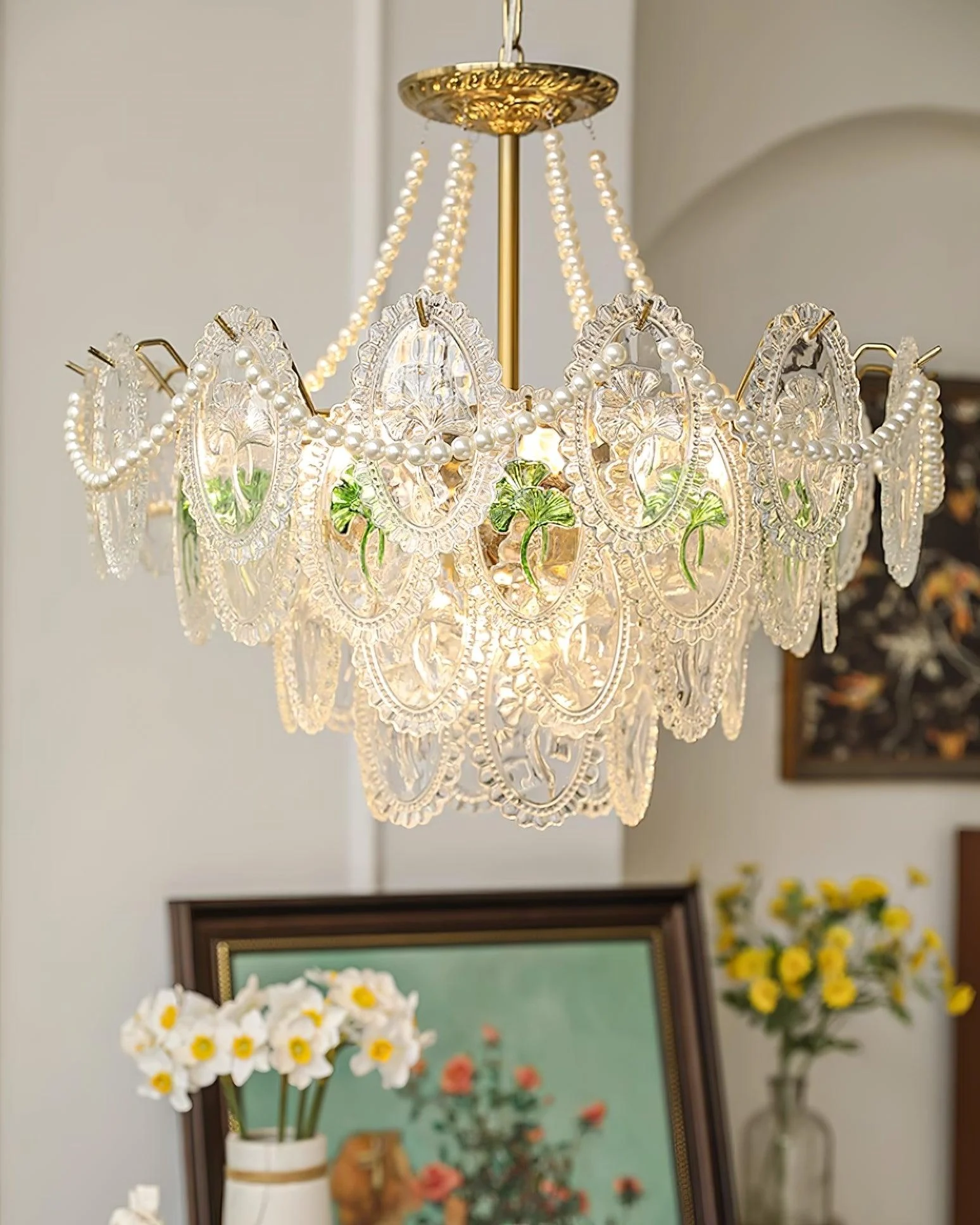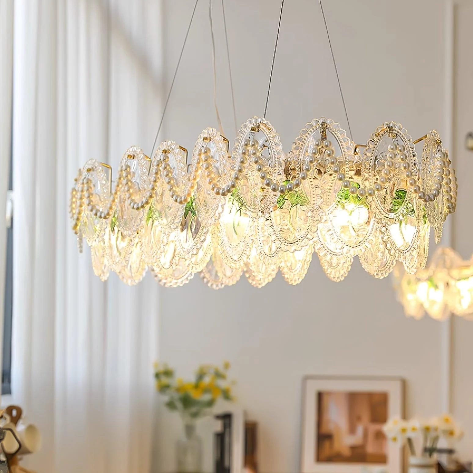 The pearls are harmoniously combined with golden metal to create a chandelier design that exudes a modern and elegant look. It shines with a transparent finish, ensuring its vibrant color and abundant light will be preserved forever. Perfect for enhancing any room in your home with a colorful theme, this chandelier is bound to add a touch of everlasting charm.