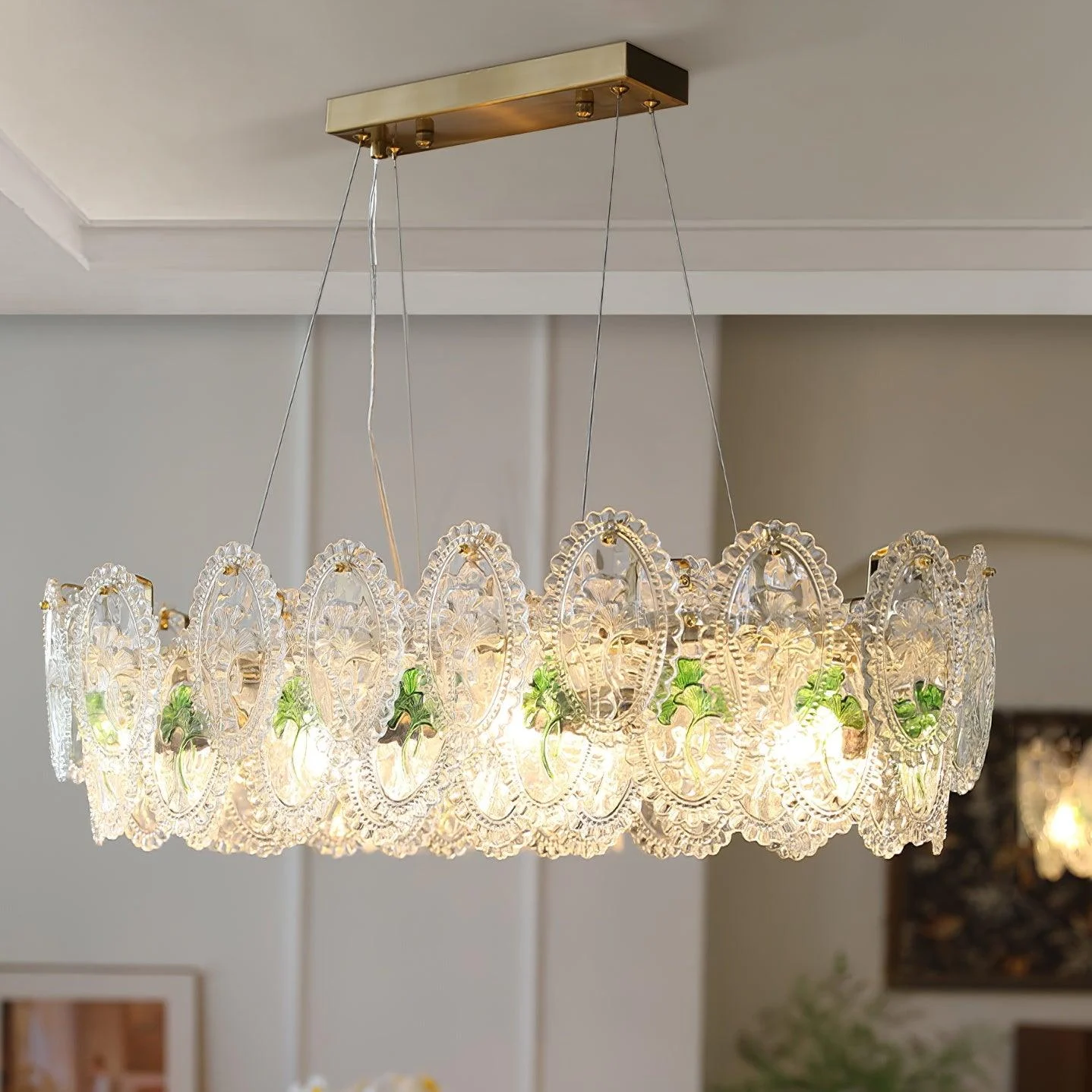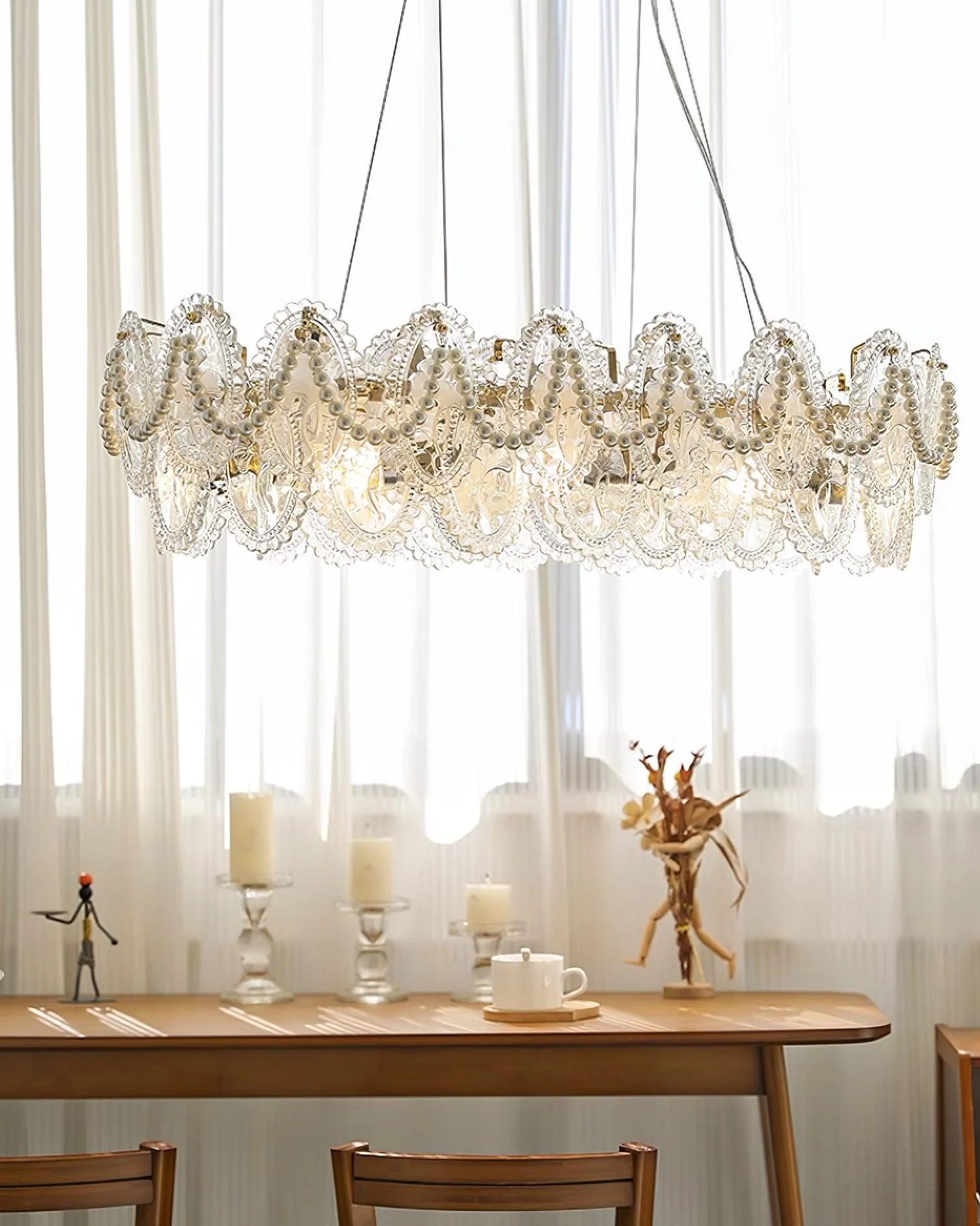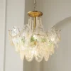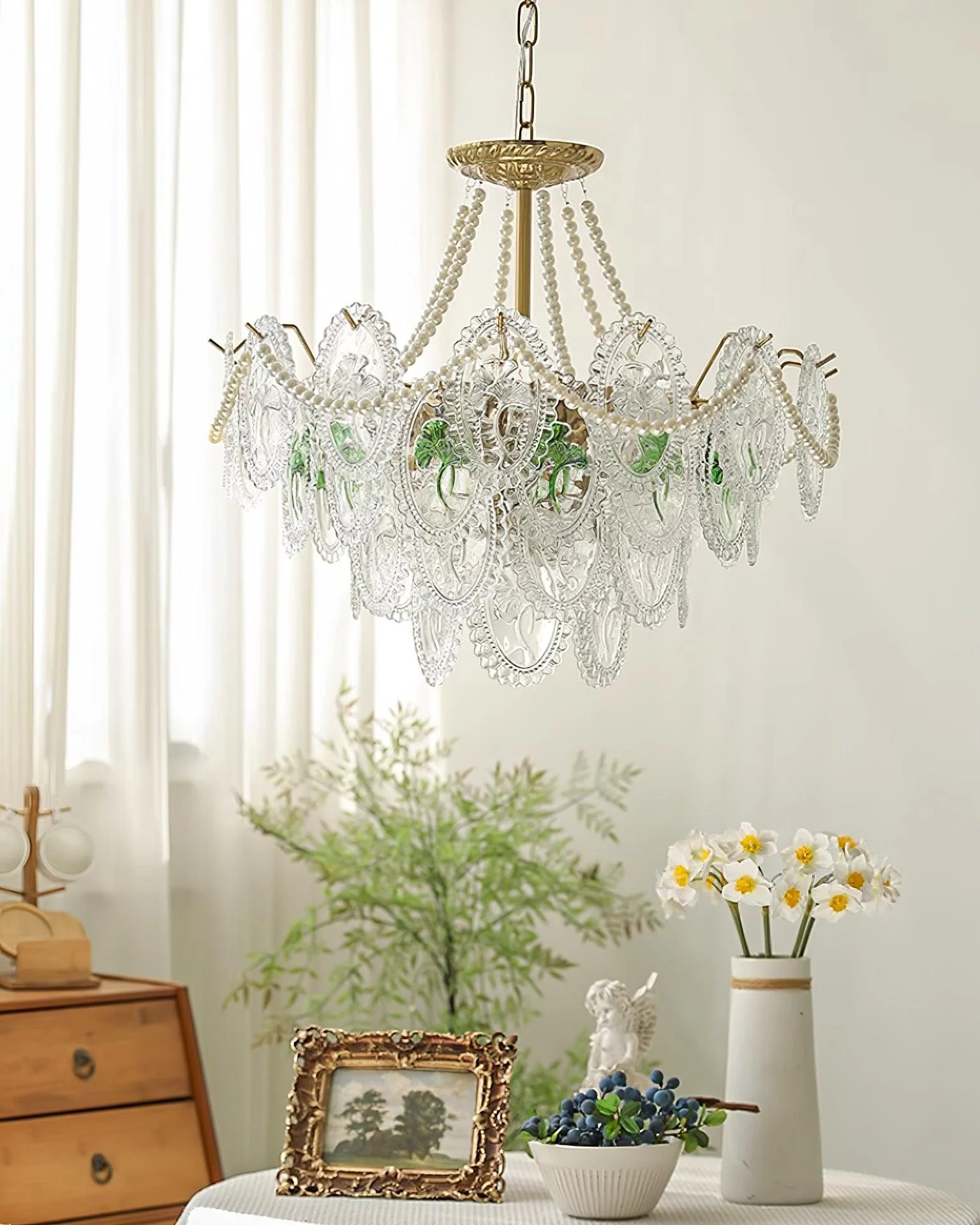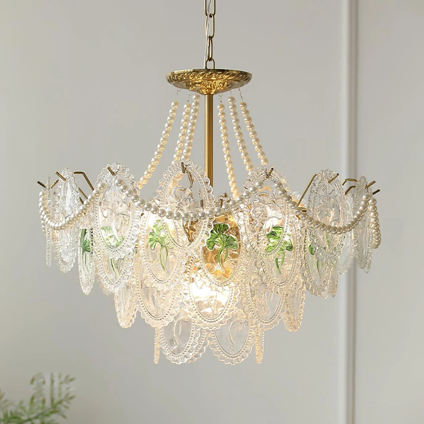 The pearls are harmoniously combined with golden metal to create a chandelier design that exudes a modern and elegant look. It shines with a transparent finish, ensuring its vibrant color and abundant light will be preserved forever. Perfect for enhancing any room in your home with a colorful theme, this chandelier is bound to add a touch of everlasting charm.