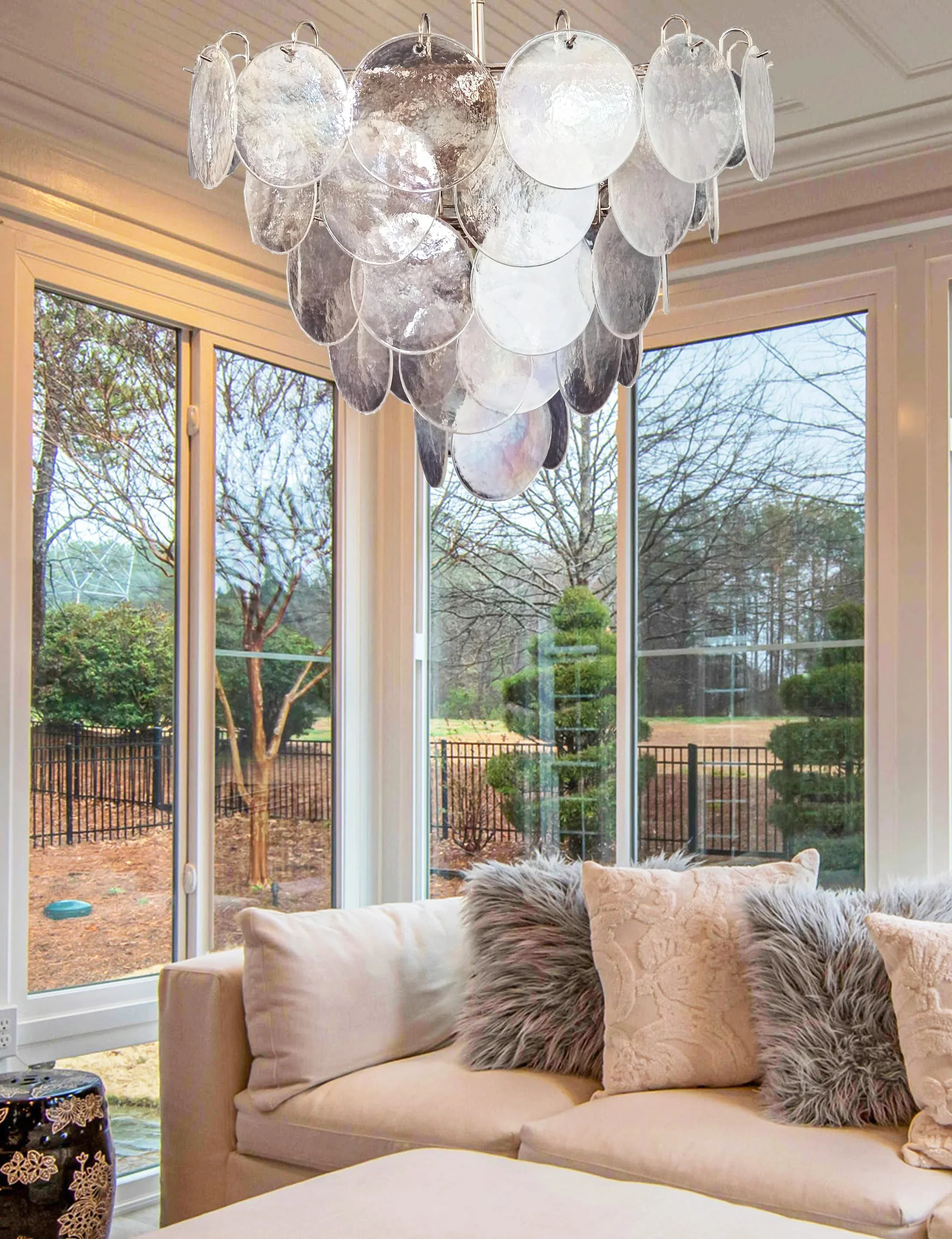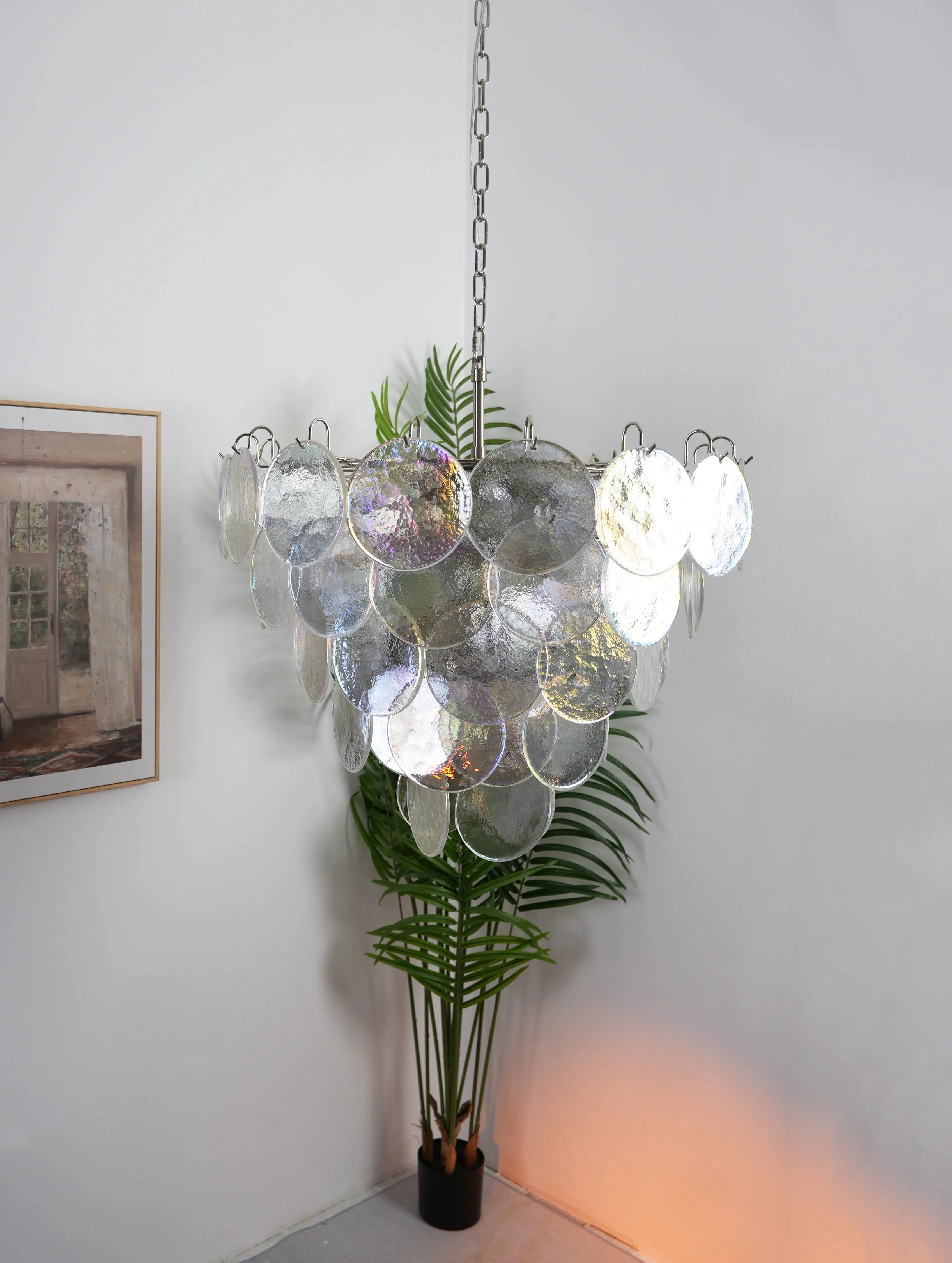 Elevate your home decor with our Vintage Iridescent Murano Disc Glass Chandelier. Featuring exquisite Iridescent glass disks, this chandelier combines contemporary design with classic craftsmanship to create a mesmerizing focal point in any room. Its warm and inviting glow adds a touch of elegance to any space.