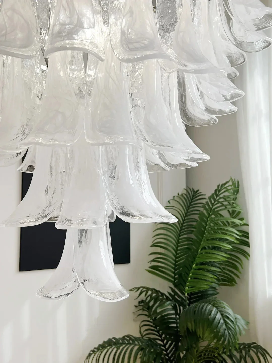 Experience the decadent beauty of the Vintage Murano Clear Glass Petals Chandelier. Handcrafted with delicate transparent petals, this chandelier adds a touch of luxury and sophistication to any space. Its soft illumination creates a warm and inviting atmosphere, making it the perfect addition to your home.