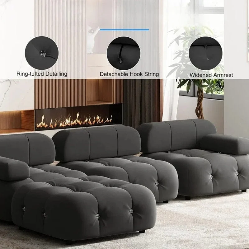 Vird modular sectional bubble sofa is not a fixed combination. It allows you to create multiple combination modes in different actual occasions and easily switch between armchair, loveseat, chaise longue and sofa. The movable ottoman adds versatility and convenience. Our modular convertible bubble sofa is crafted from velvet fabric. The luxurious velvet fabric not only provides a visually appealing and comfortable surface, but also has the advantages of elasticity, no lint, no pilling and is designed to be skin-friendly. It is easy to maintain and retains its good looks even with the wear and tear of daily use.