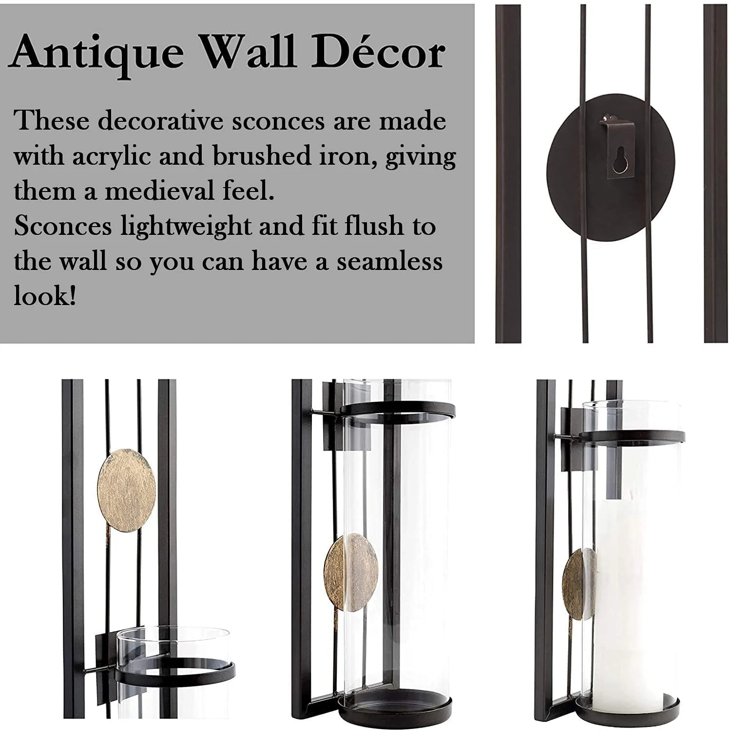 - [Retro Candle Sconces] The wall candle holder provides a fabulous look to spaces. It is available in a pair, and each holder has an openwork rectangular silhouette and a cylindrical acrylic shade. You can use the holder for pillar candles or flameless LED Light to brighten rooms.
