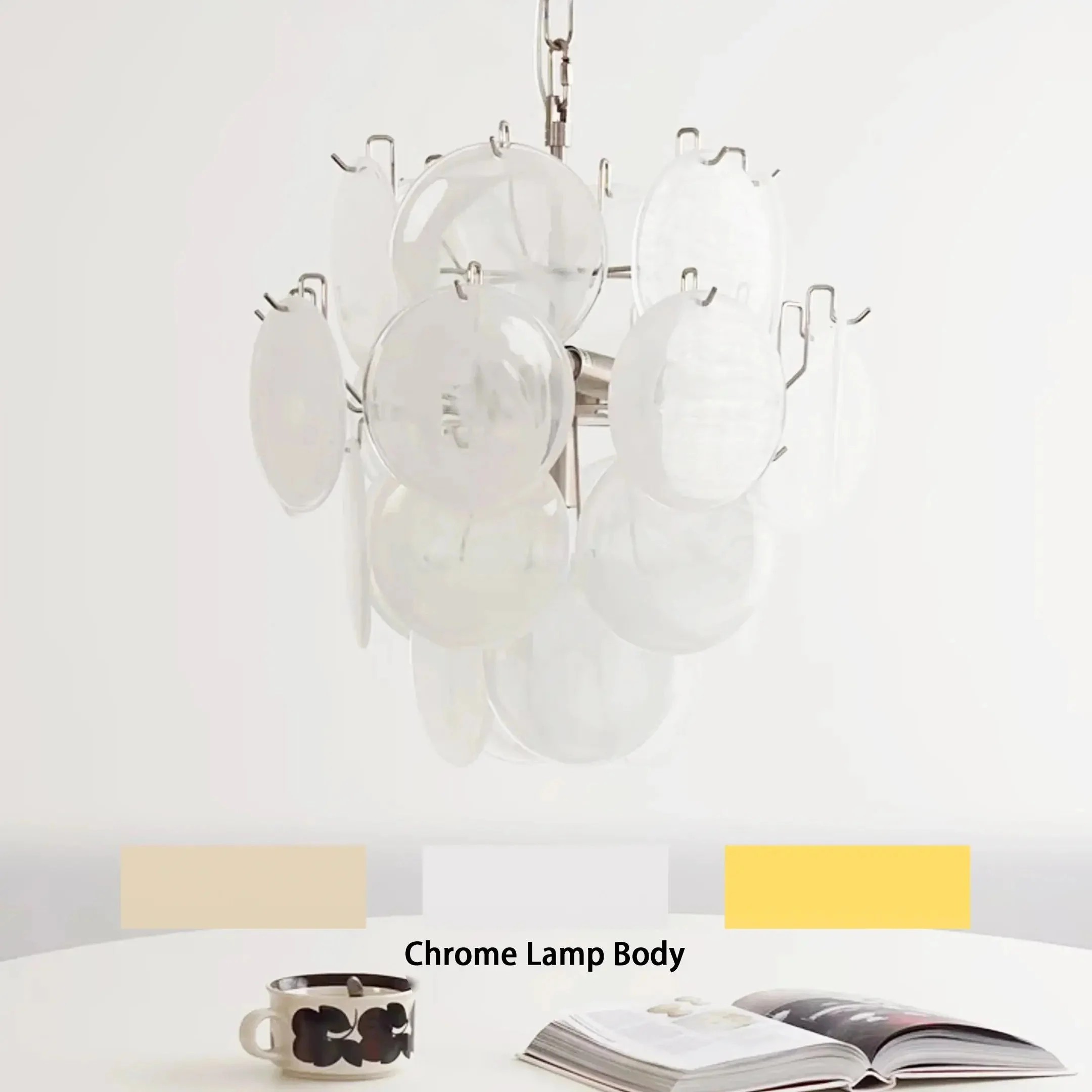 Embrace vintage elegance with our White Murano Disc Glass Chandelier. This stunning piece adds a touch of charm to any room, serving as a captivating and sophisticated centerpiece. The vibrant pink color and unique design make for a striking visual impact, while the warm glow exudes a welcoming and inviting atmosphere. Elevate your home decor with our White Murano Disc Glass Chandelier.