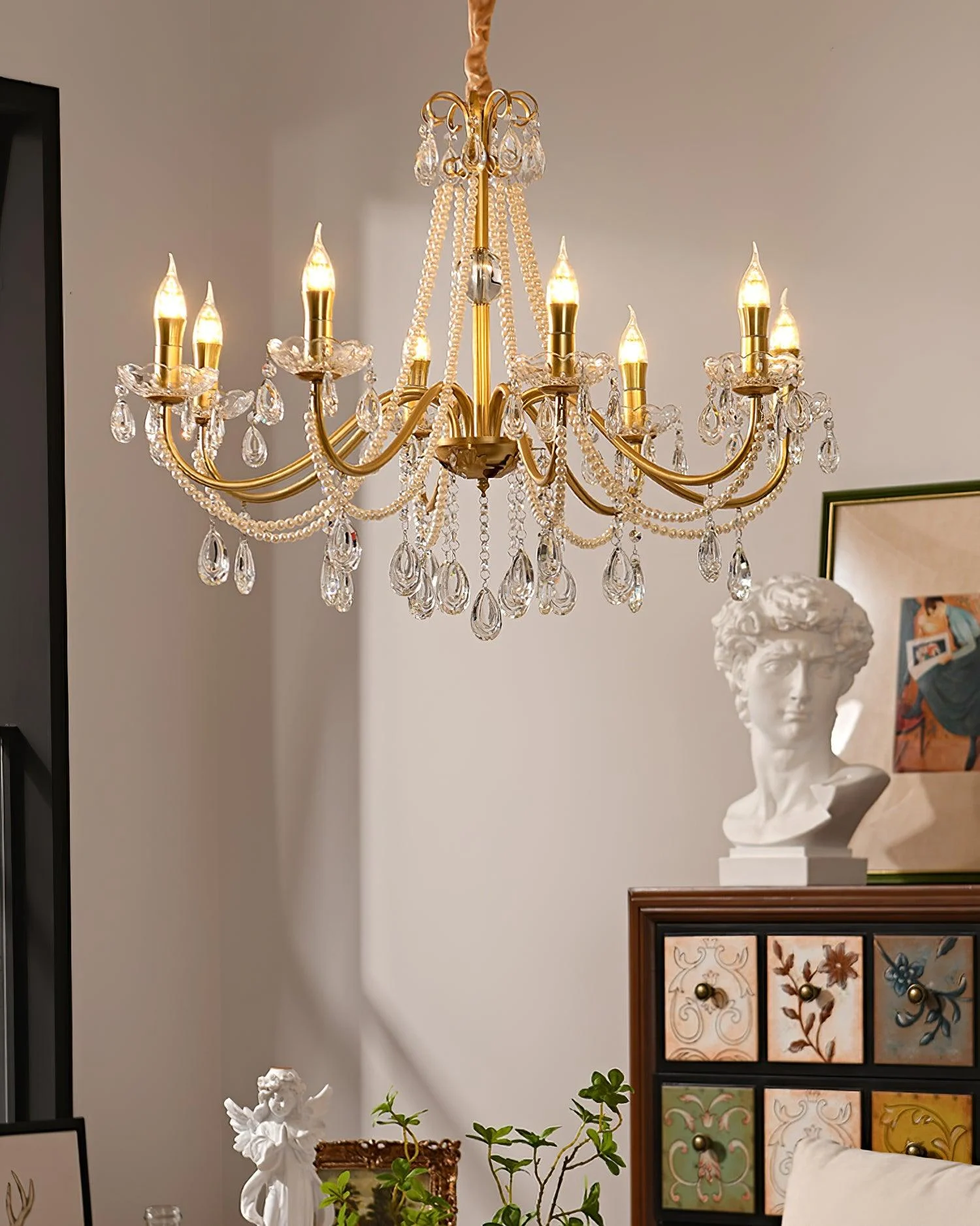 This Willa Crystal Chandelier stands out with its exquisite design and unparalleled elegance. The golden metal frame is combined with finely crafted crystal beads and teardrop crystals, creating a luxurious and refined visual feast. Each crystal is meticulously carved to maximize light refraction, ensuring it shines brilliantly for both everyday illumination and special occasions.