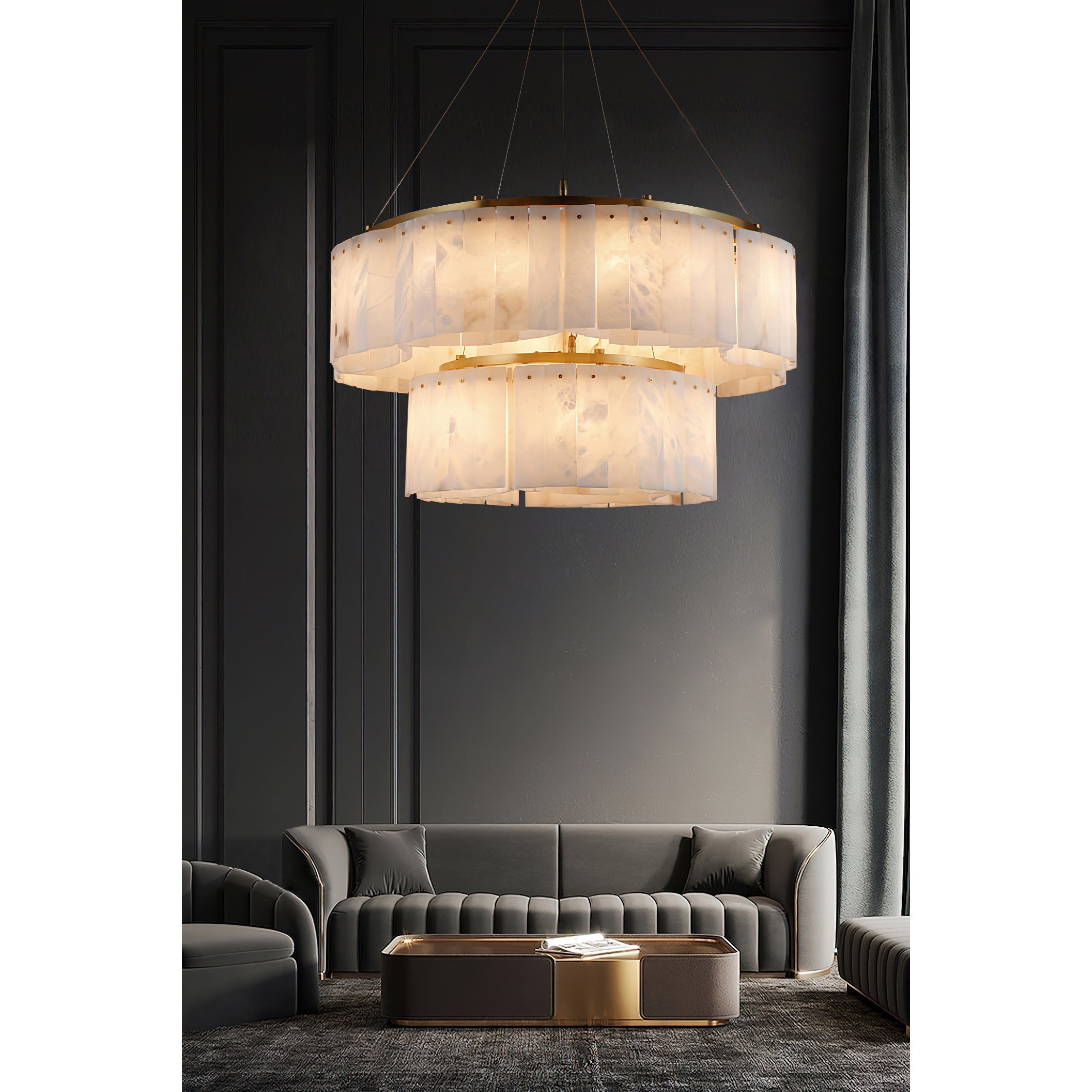 This superb chandelier in rare white alabaster recalls the subtle elegance of a scale. Minutely handcrafted and its electric system renovated, heir glow illuminating the surroundings and enhancing the stone’s natural traceries. A precious brass finish enriches the metal frame.