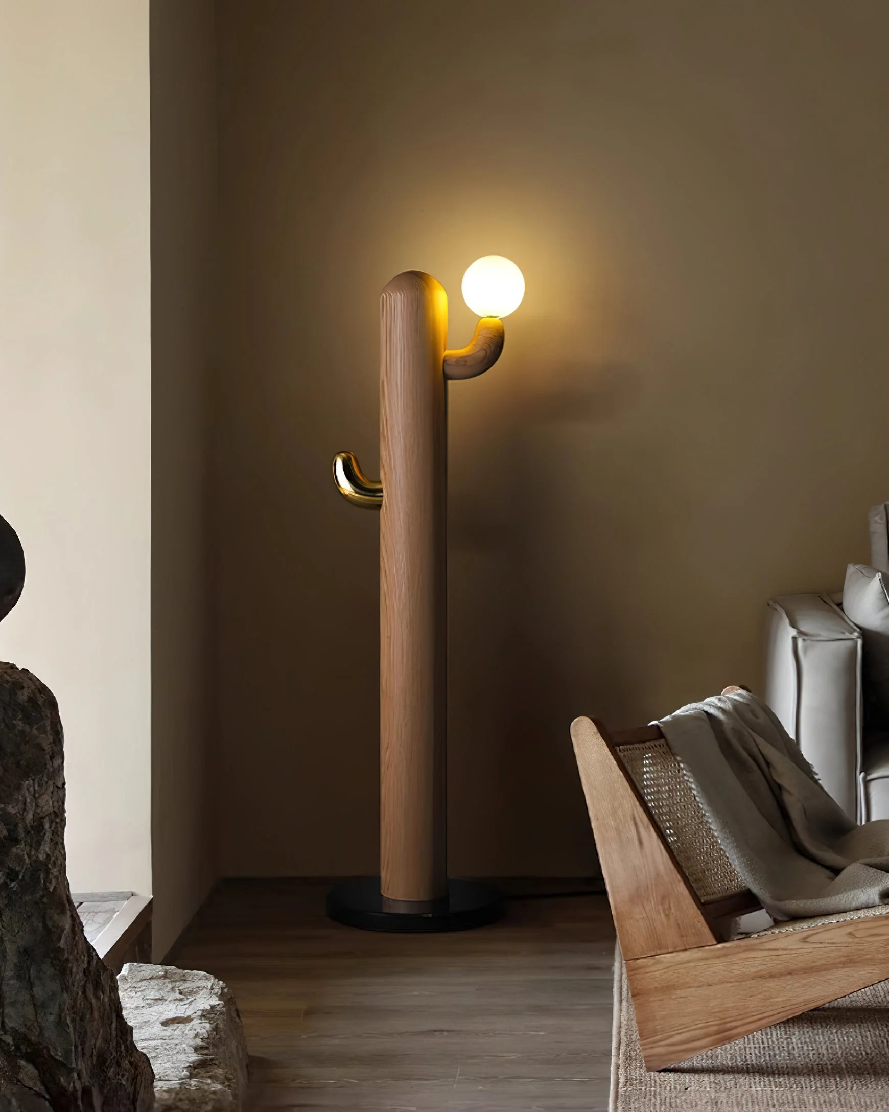 Introducing the Wooden Cactus Floor Lamp by Docos – a distinctive lighting solution that effortlessly merges modern design with organic elements. Crafted with precision, this lamp features a unique cactus-inspired silhouette, standing tall with an elegant wooden finish that adds warmth and sophistication to any space.The lamp’s body is constructed from high-quality wood, providing a natural touch that harmonizes beautifully with the sleek brass accents, creating a striking contrast.