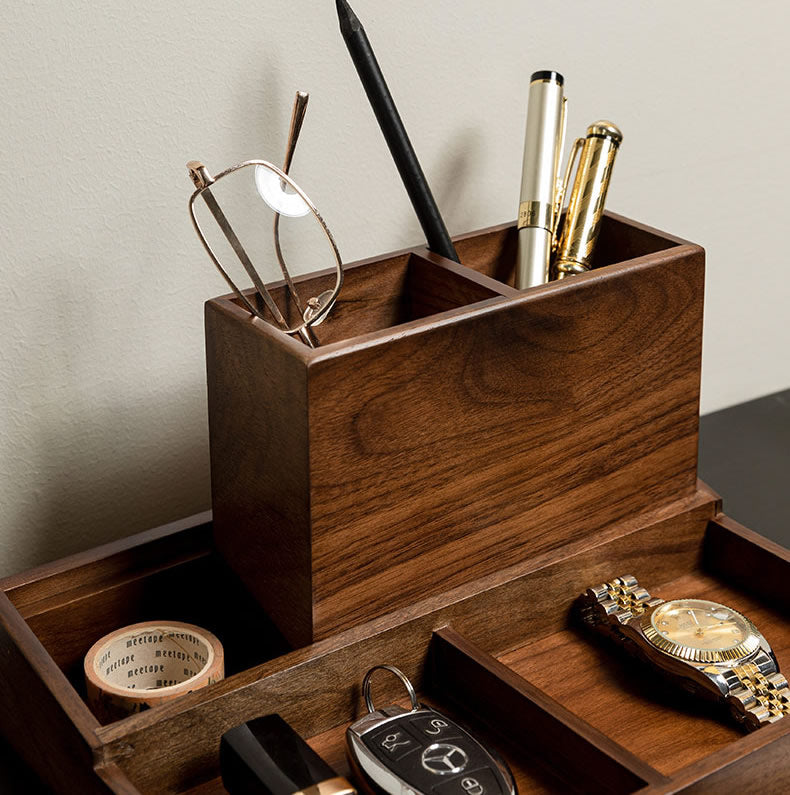 The classic design of this box, crafted from black walnut, adds a touch of elegance to any desk. Keep your essentials neatly sorted and easily accessible.