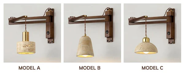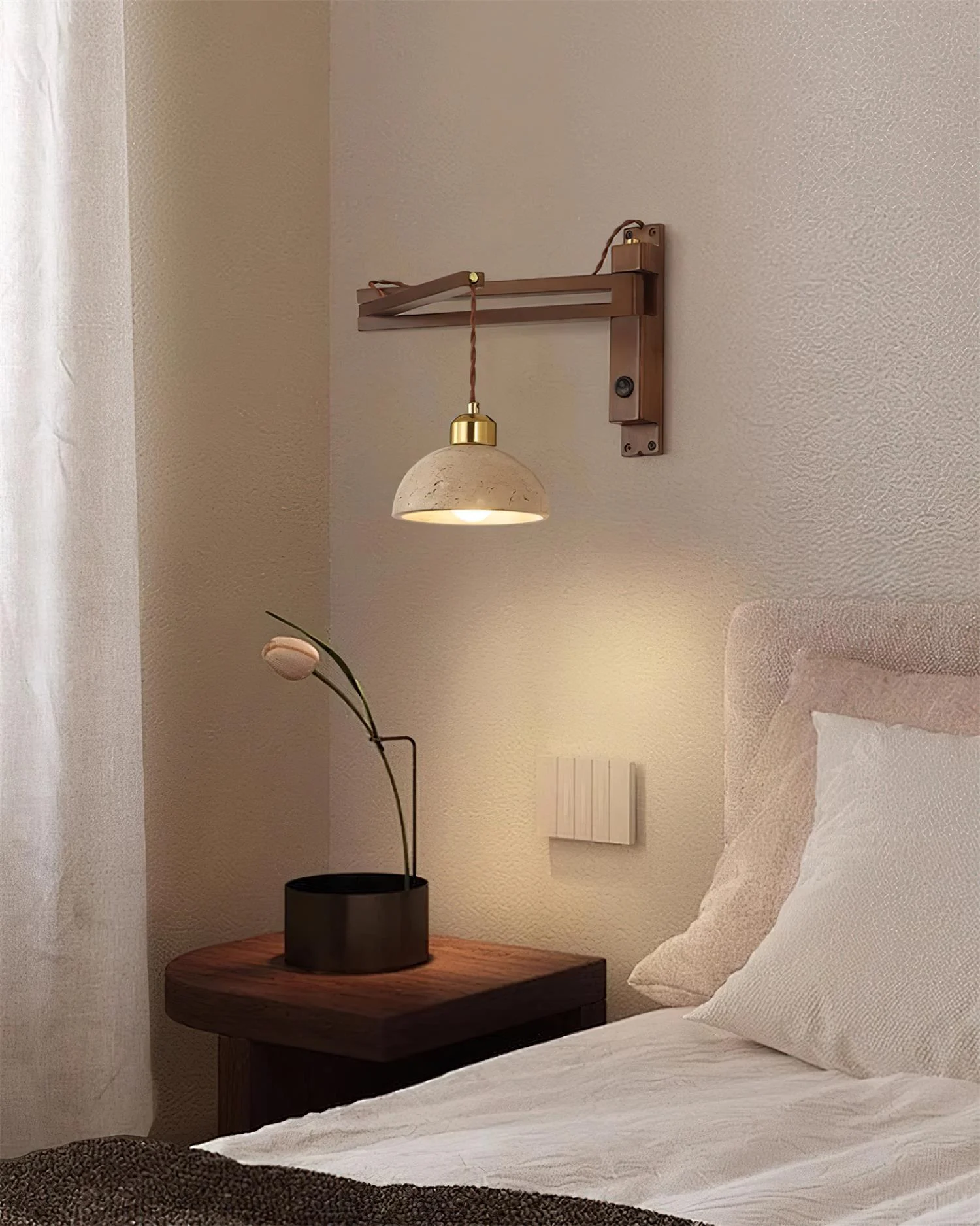 The Zaid Wall Lamp from Docos combines a rustic charm with modern functionality, featuring a wooden swing-arm design and a natural travertine lampshade. Perfect for cozy living spaces, this lamp provides warm, diffused lighting, ideal for reading or accenting a room. Its adjustable arm ensures versatility, making it a stylish and practical choice for any interior decor.